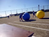 | 子供たちの楽しそうな、この笑顔! BIG BOSS(長谷川教育長)が、1、2年生の体育の授業を行いました。準備運動では2人組の楽しい運動で、たくさん頭と身体を動かしました。ラグビーボールを使ったリレーでは、チームで走る順番や役割を決めて行いました。子供たちは様々な方向に飛んでいくボールに苦戦しながらも楽しく取り組むことができました。「またやりたい!」と子供たちはBIG BOSSの周りに集まっていました。 |